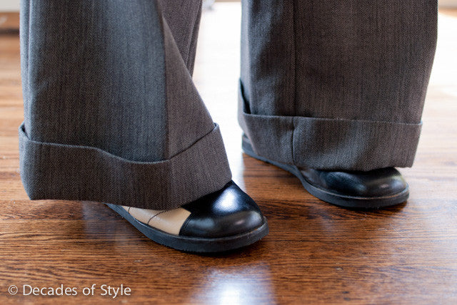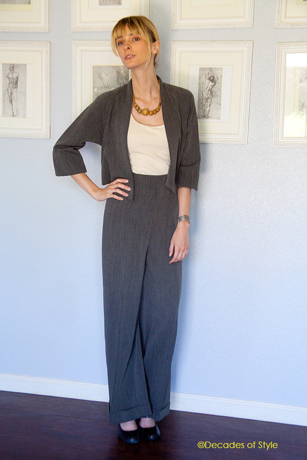 Want to know how to make your legs look long and sleek? Try a pair of high-waist pants from this vintage pattern. Deep cuffs and wide legs on the trousers really capture the look of the 40s.