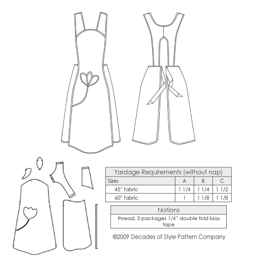 This vintage apron pattern is for a smock-style apron with a sweet tulip pocket. All edges are finished with fold-over bias tape.